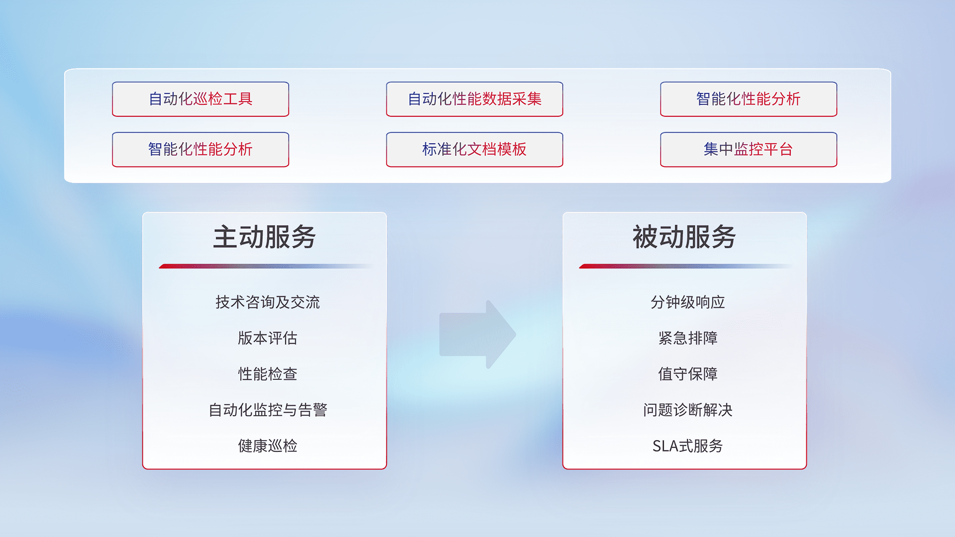 智能化工具和标准化文档,,保障服务质量,,,,提供主动服务(包含技术咨询、、版本评估、、、、性能检查、、、自动化监控与告警、、、健康巡检)和被动服务包含(分钟级响应、、、紧急排障、、、值守保障、、、问题诊断解决、、、、SLA服务)。。