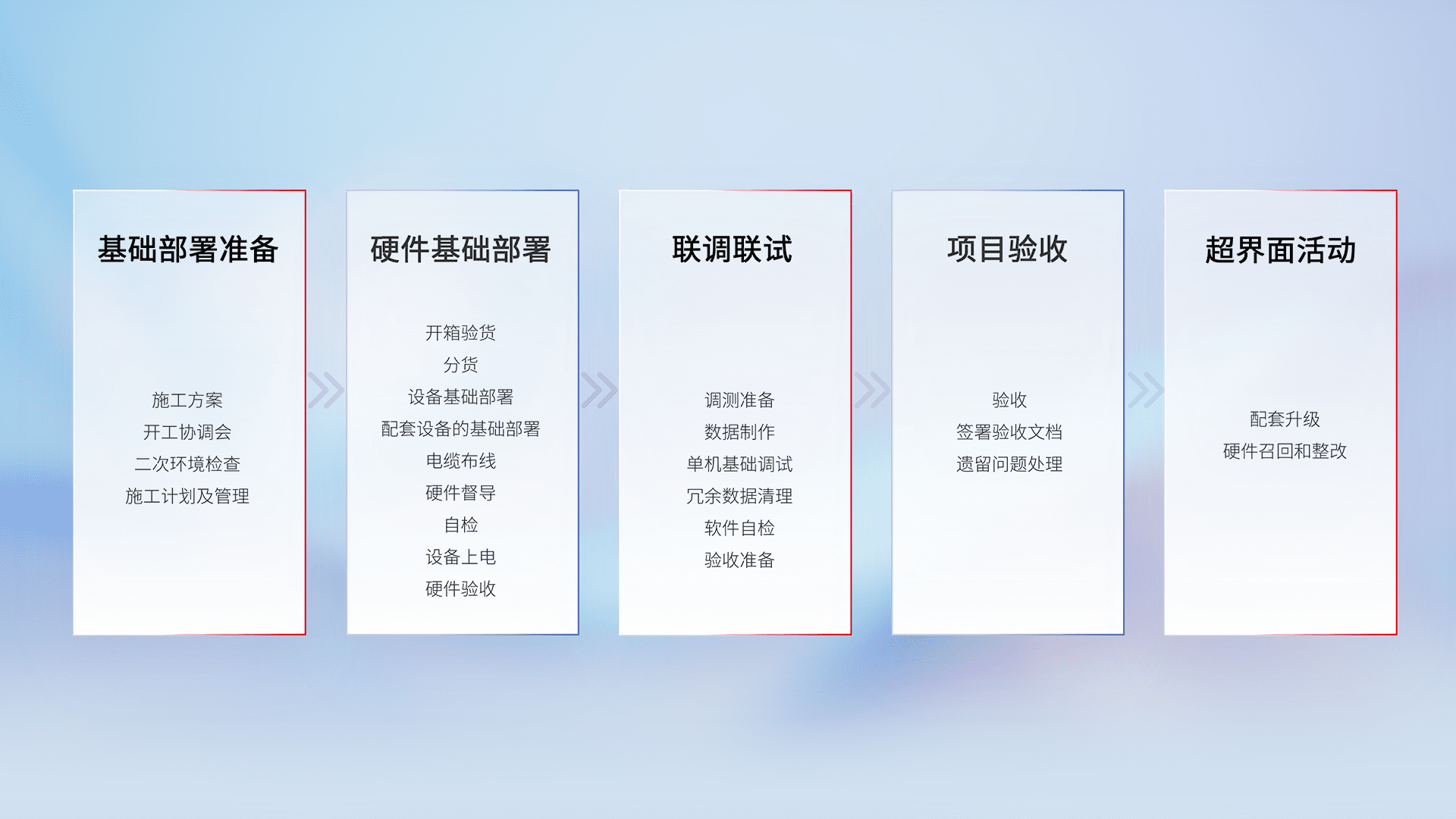 从基础部署准备、、硬件基础部署、、联调联试、、、、项目验收、、、越界面活动的全过程可追溯,,,,保证施工质量和进度。。。